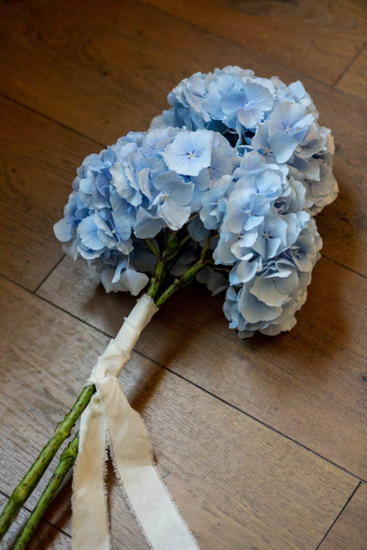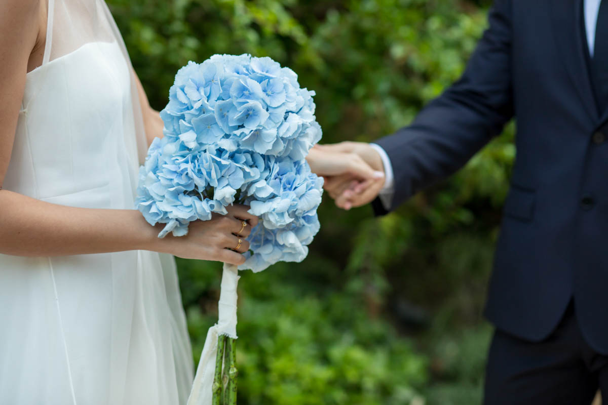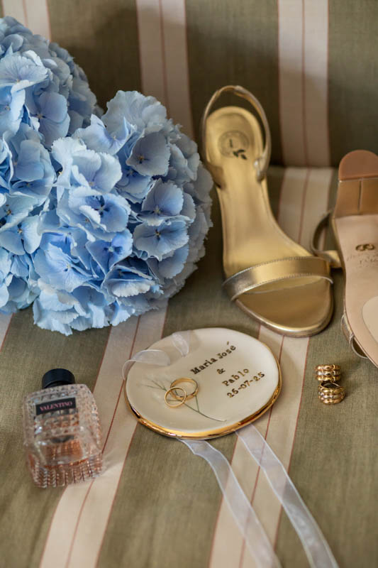 Al igual que el delicado ramo de hortensias azules que lució María José.